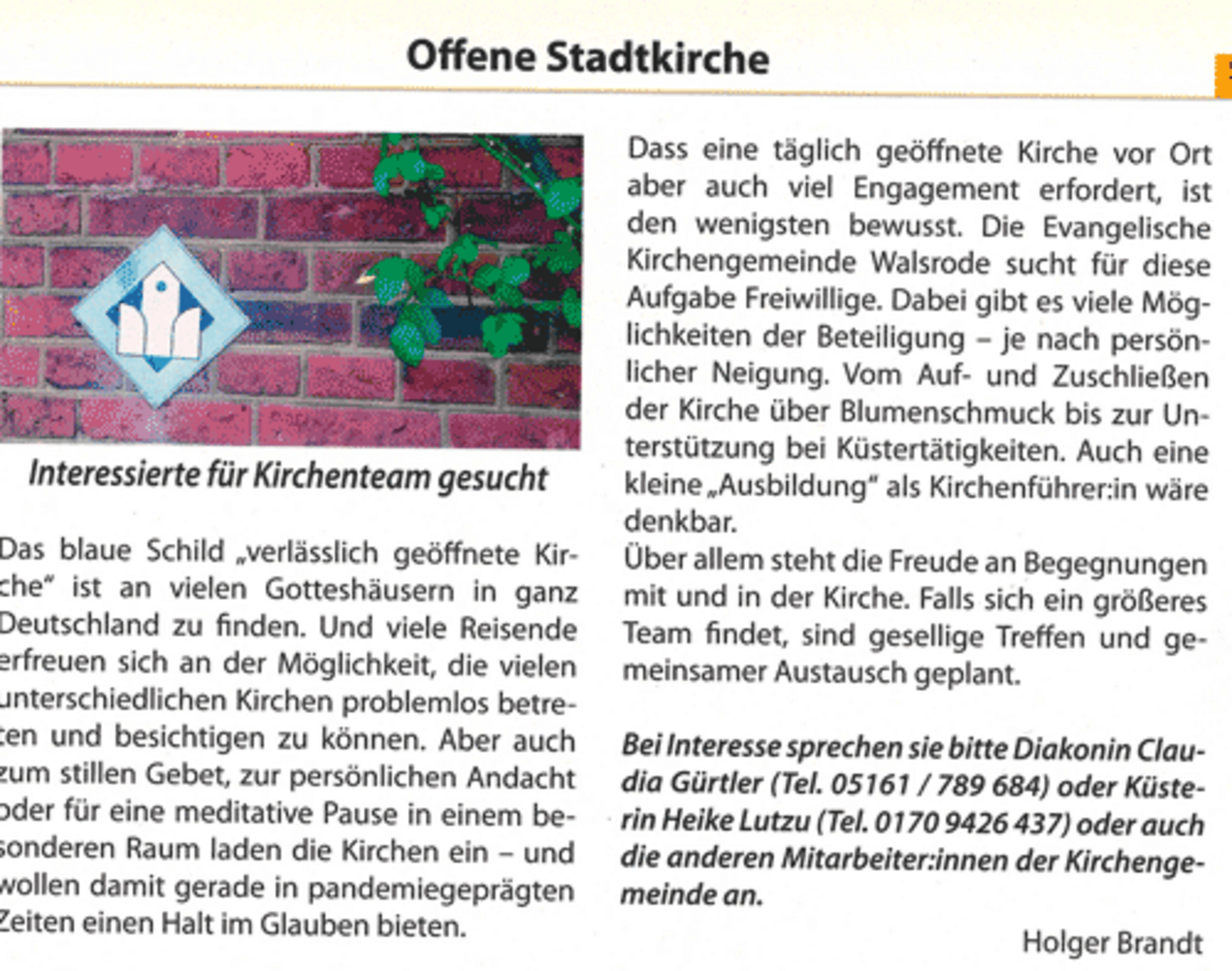 Betreut wird die Kirche von Küsterin Heike Lutzu. Sie wird von Ehrenamtlichen unterstützt und vertreten bei der Vorbereitung und Begleitung von Gottesdiensten, beim Herrichten und Schmücken der Kirche.