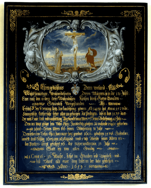 - Das Epitaph des Pastoren Gabriel Meyer (geb. 1608 in Walsrode) Er übernahm 1640 das Pfarramt in Walsrode als Nachfolger der 3 Pastoren Kelp, lebte bis 1679.