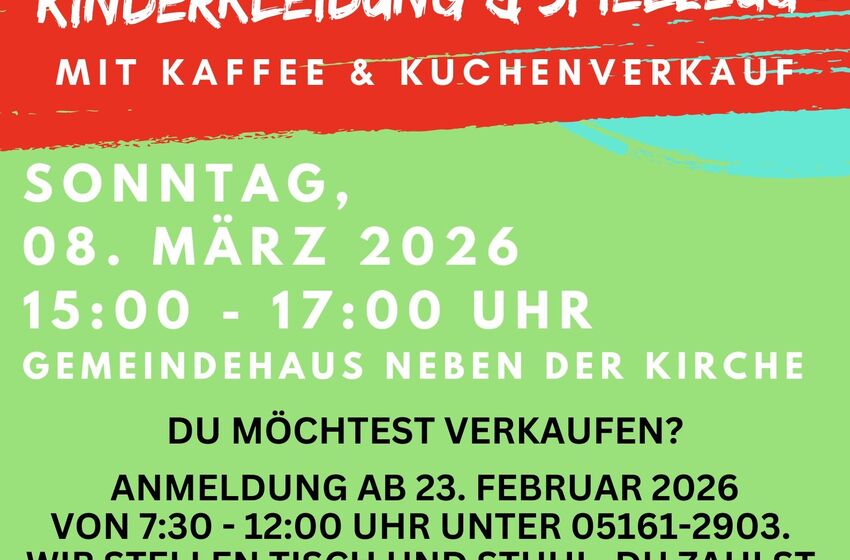 Am Sonntag, den 08. März 2026 findet von 15:00 bis 17:00 Uhr wieder der Flohmarkt für Kinderkleidung und Spielzeug im Gemeindehaus Walsrode statt. Verkauft und gekauft werden können gut erhaltene ...