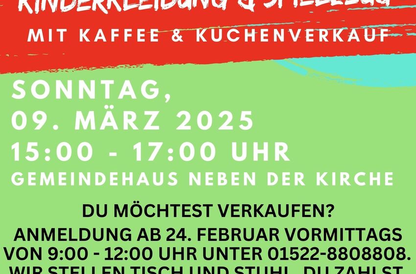 Am Sonntag, den 09. März 2025 findet von 15:00 bis 17:00 Uhr wieder ein Flohmarkt für Kinderkleidung und Spielzeug im Gemeindehaus Walsrode statt. Interessierte Verkäuferinnen, können sich ab 24. ...